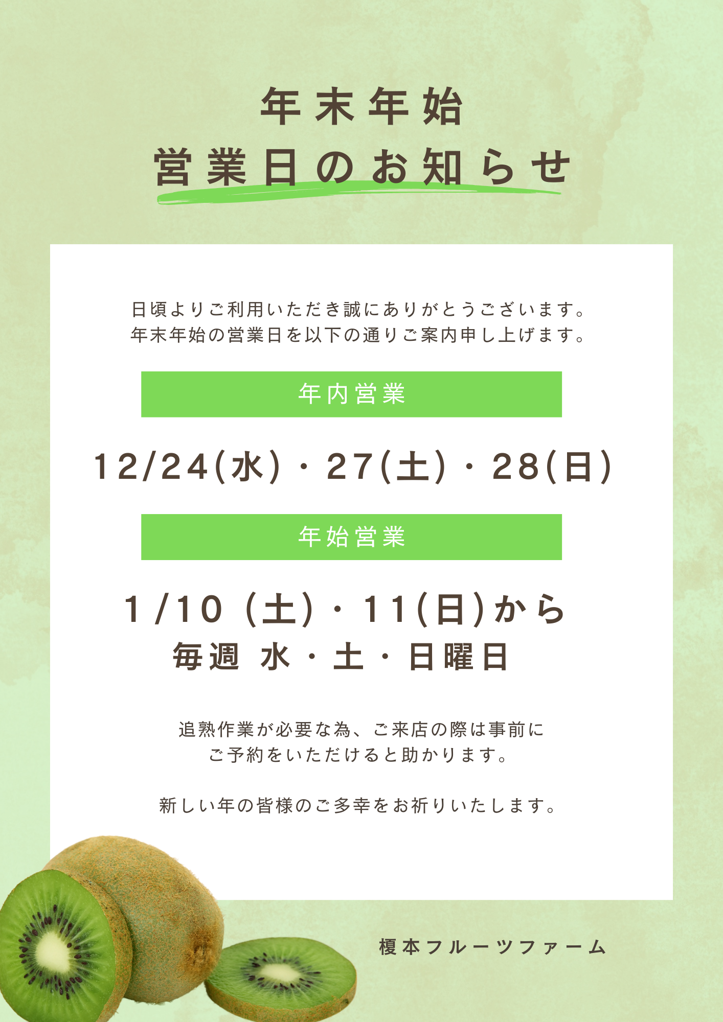 年末年始の営業日 2025 12/23 お知らせ キウイ 2025年12月23日 店舗限定 袋入りのヘイワード(緑)は、年内で販売終了予定です。 数に限りがございますので、売り切れ次第終了となります。 年始からは、東京ゴールド(黄)のみの販売となります。 宜しくお願い致します。 お知らせ キウイ よかったらシェアしてね! URLをコピーしました! URLをコピーしました! 箱入り キウイフルーツ この記事を書いた人 榎本フルーツファーム 関連記事 箱入り キウイフルーツ 2025年12月23日 コメント コメントする コメントをキャンセルコメント ※ 名前 ※ メール ※ サイト 次回のコメントで使用するためブラウザーに自分の名前、メールアドレス、サイトを保存する。 Δ